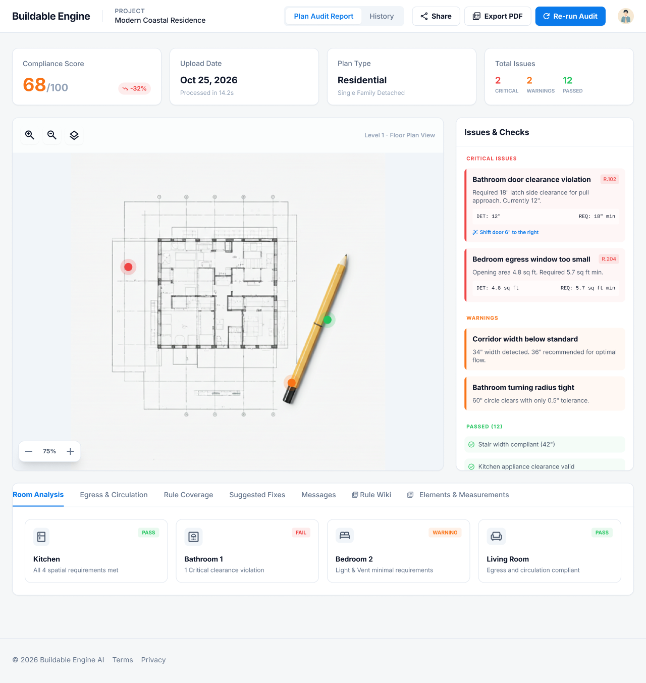 Buildable Engine v2.0 Launches today, bringing Buildability Intelligence to the market as a working product. Here's a walkthrough of what Buildable Engine actually does: from uploading a floor plan to a compliance score, cited violations, AI-suggested fixes, and a design you can stand behind. All in seconds, before a permit is filed.